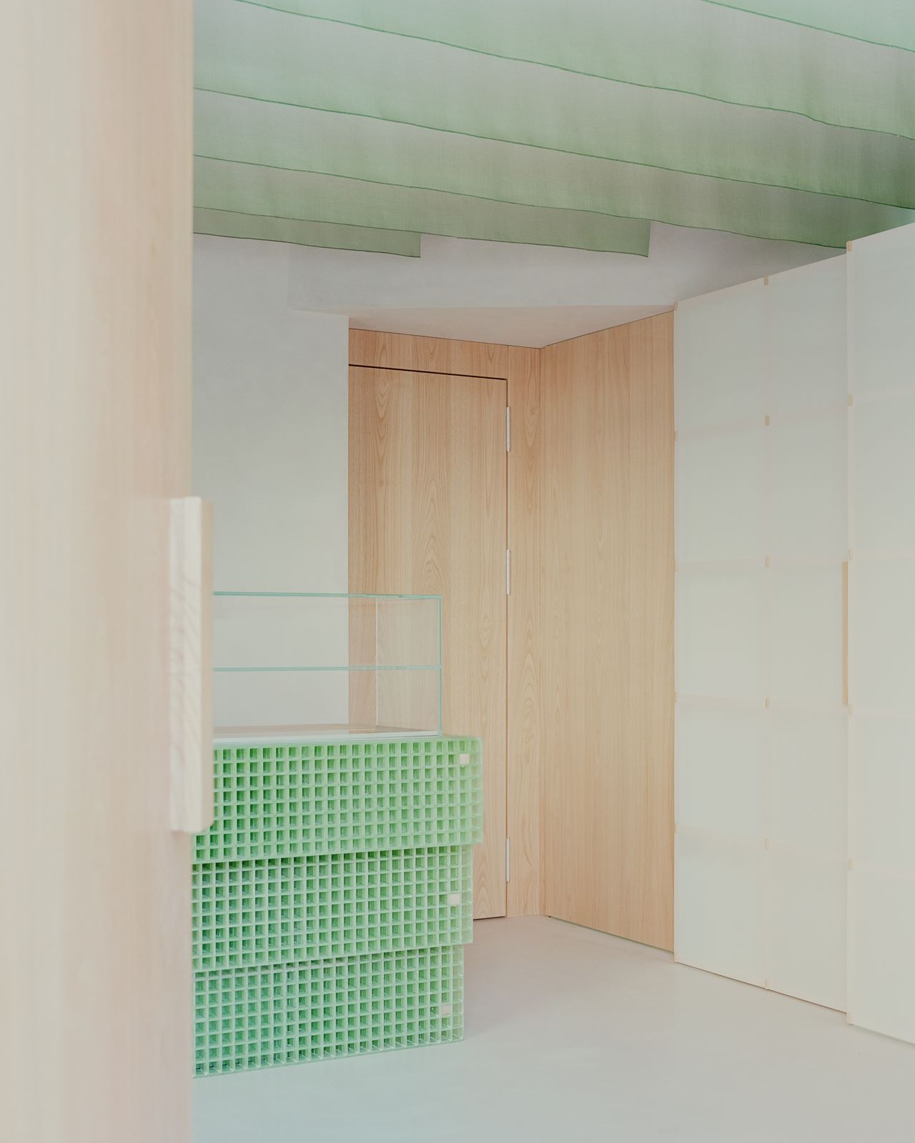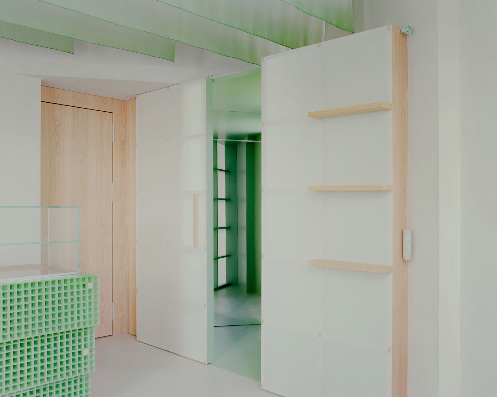 The bread counter emerges as the protagonist as soon as you enter and has its material anticipation in the external bench. Made of green fiberglass grid panels, it is a small piece of architecture that inhabits the space and reacts with natural light. Its color dialogues with the nuanced shade of the noren, the ceiling drapes that create a suspended three-dimensional world.