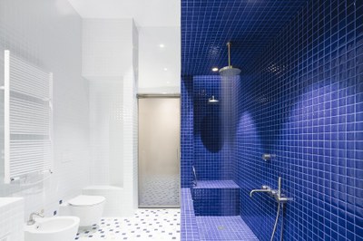 Then, the foyer-gallery and the living room provide the spatial and conceptual connection between the public pole and the private pole, while the curves of their backlit ceilings are surprising and hint at the ancient vaults of the Palazzo, filtered through the formal influence of two famous late-modernists houses like Le Corbusier’s Maisons Jaoul and Alvar Aalto’s Maison Carré.