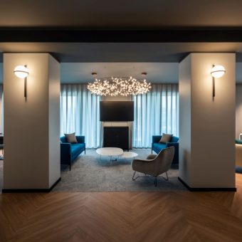 The fifth and last floor, dedicated to members, is open and without dividing elements, conceived as a lounge bar to enjoy during lunch breaks and capable of hosting daytime or evening events. The look and feel is based on the upper part of the tree, with bright blue and copper colours evoking the sky and a central chandelier that recalls its foliage.