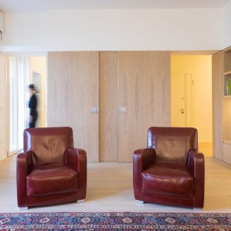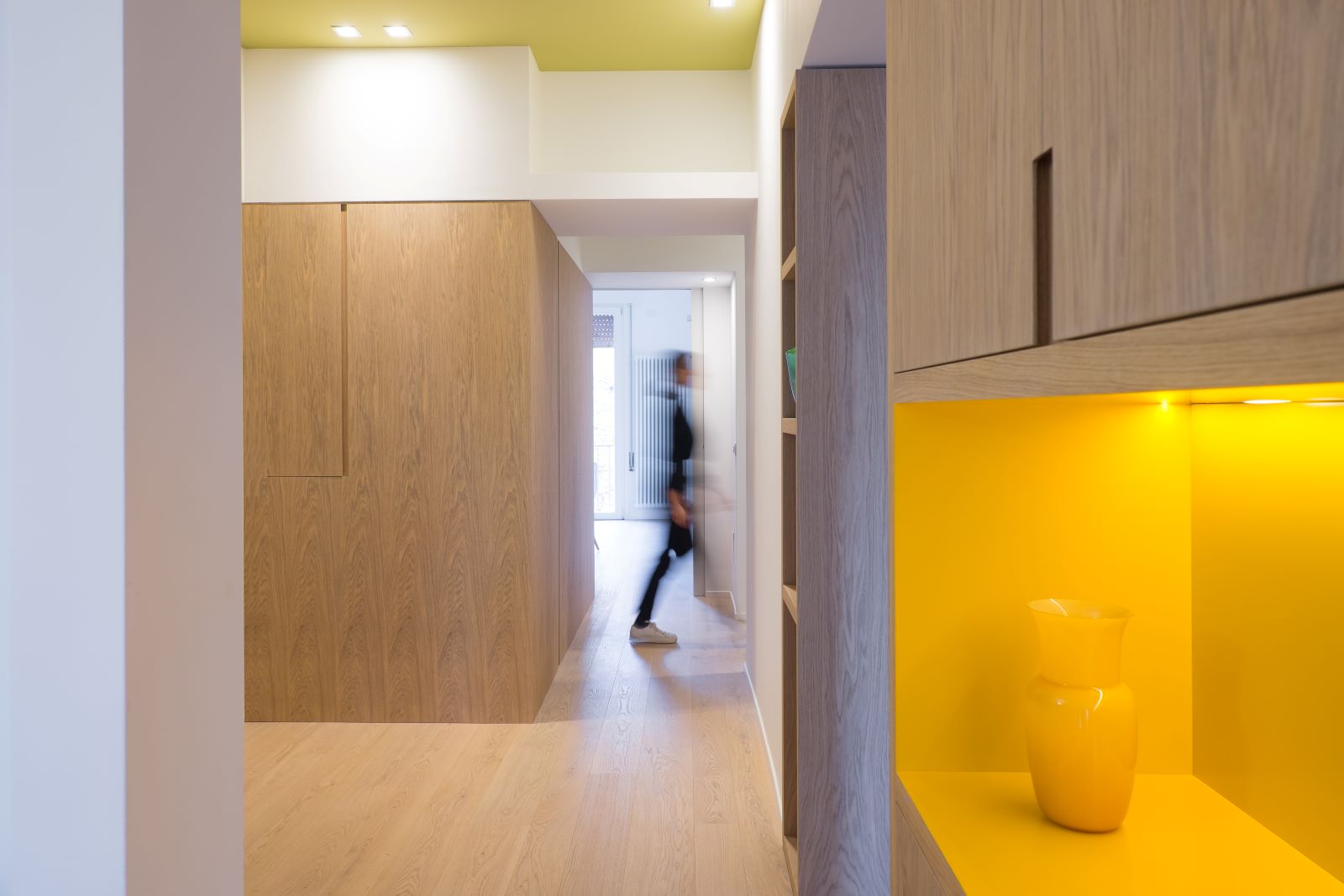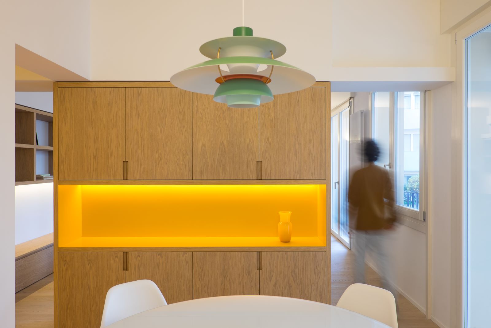 The apartment enjoys two opposite views, one to the east and the other to the west: this geographical condition allows us to benefit from an intense natural light, which amplifies the views between the compressed spaces, service, and those of living, which dialogue with the outside.