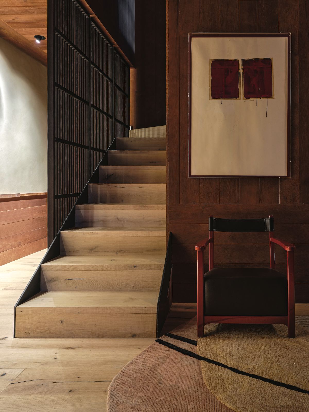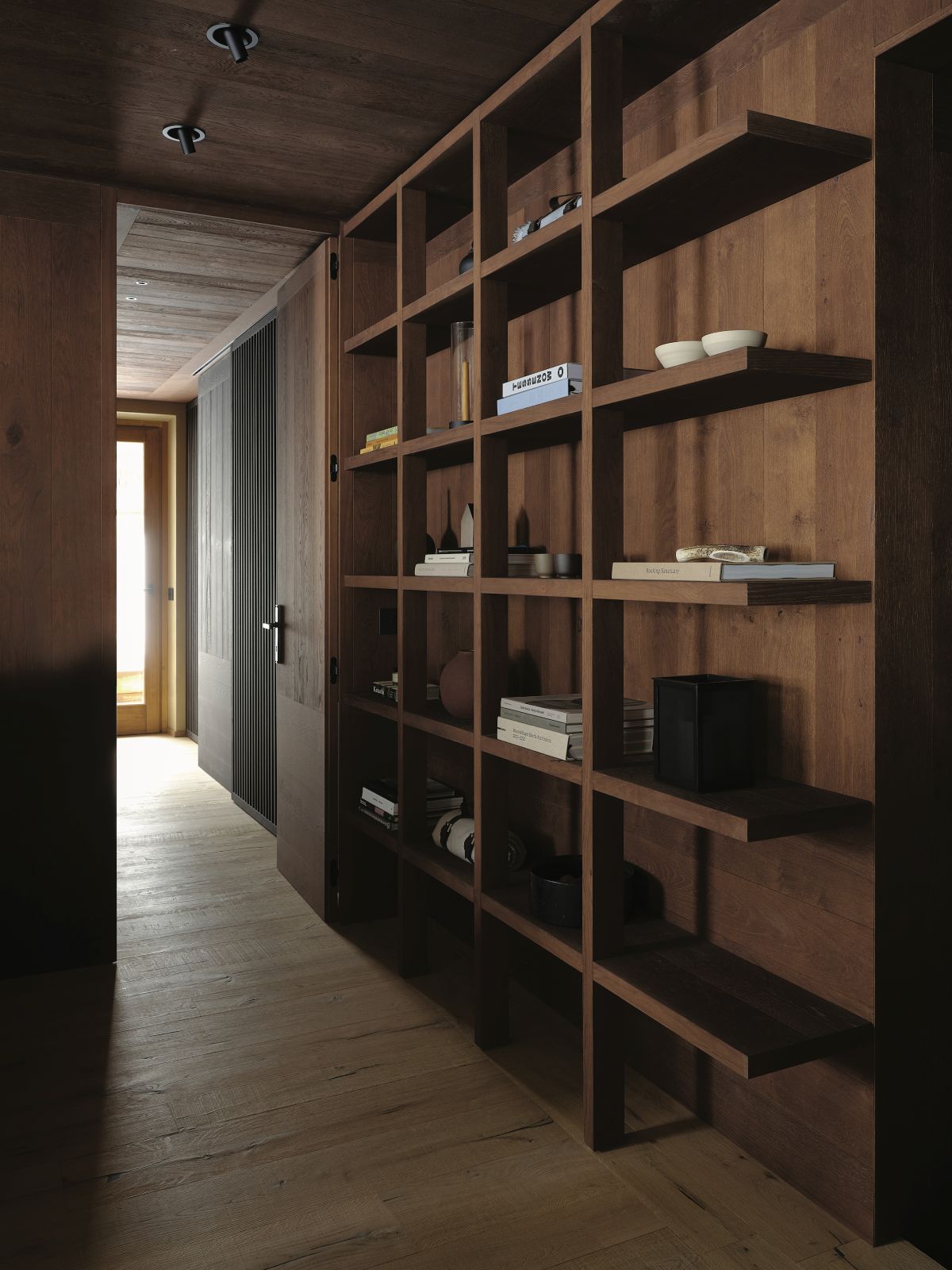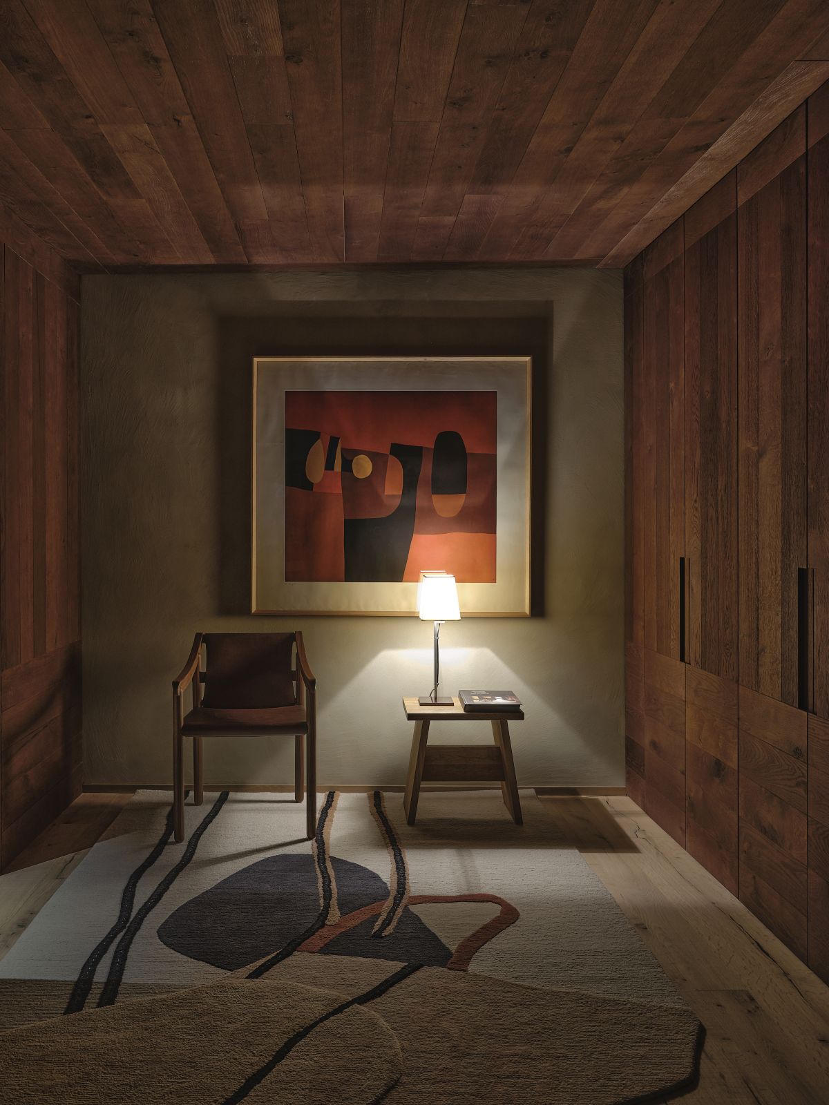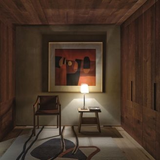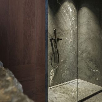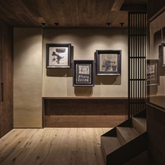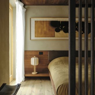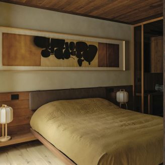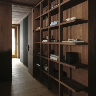 The material selection was aimed at enhancing and updating the local character of the architecture. The walls are partly finished with plasters based on natural earths and pigments by Matteo Brioni, with portions cladded in wood, specifically solid carved and treated fir wood. The floors are made of antiqued and planed oak.
