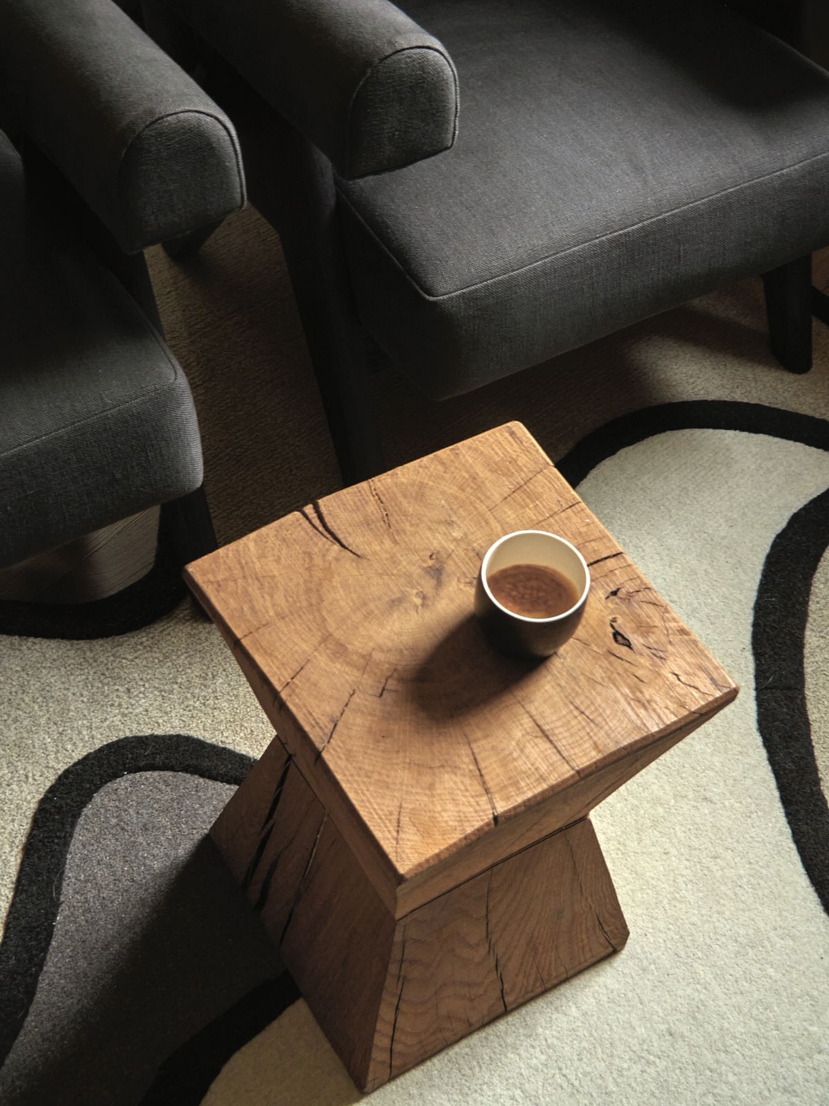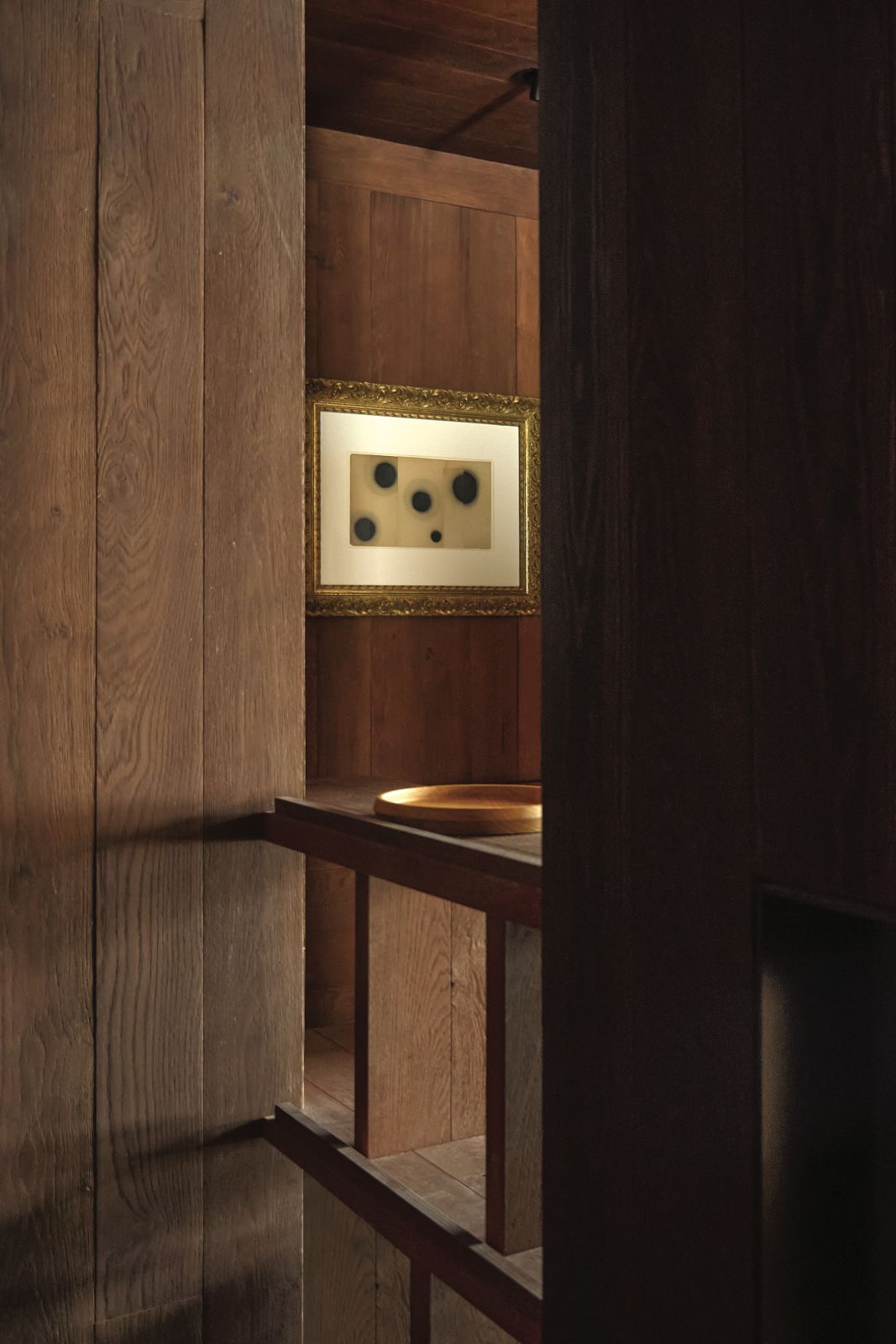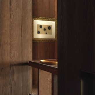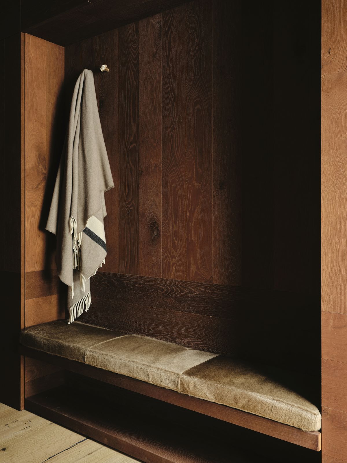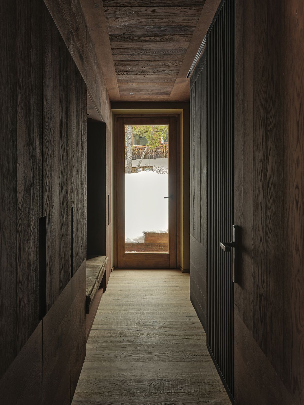 The material selection was aimed at enhancing and updating the local character of the architecture. The walls are partly finished with plasters based on natural earths and pigments by Matteo Brioni, with portions cladded in wood, specifically solid carved and treated fir wood. The floors are made of antiqued and planed oak.