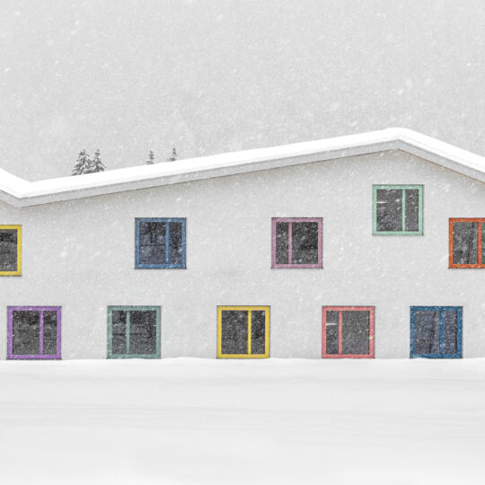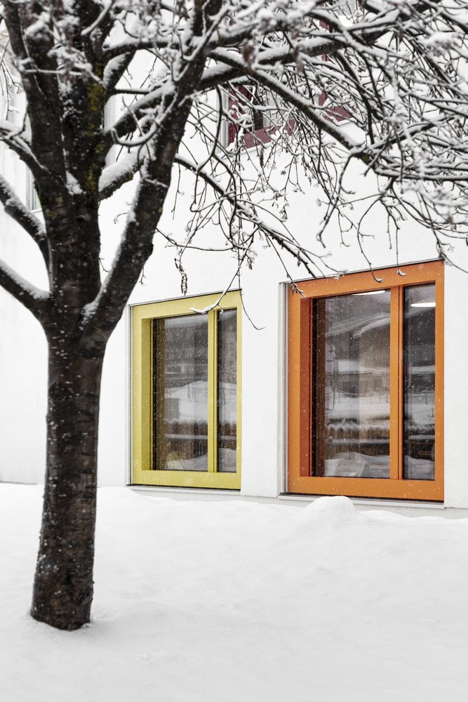 Thermal bricks, plaster and natural wood surfaces were the main materials used, while the pattern of the facade and the colorful concept reflect the playful nature of the children; on the other hand, the different heights and distances of the windows enhance the surrounding alpine landscape.