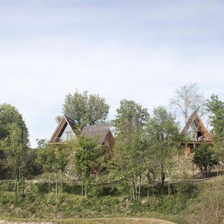 Designed with an eye on sustainability and energy efficiency using natural and eco-compatible materials, the cabins are raised off the ground, a construction approach that responds to the sloping land of the site.