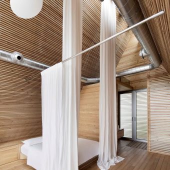 With a rectangular plan measuring 6 x 9m and a ceiling height of 5.5 m, these little lodges are made of larch treated only with oil, a natural element that’s absorbed into the wood, enriching and nourishing it as it ages. Wood is also featured in the furnishings as well as the wall and floor finishes. The cabins therefore blend perfectly with their natural setting, almost as if they were camouflaged.