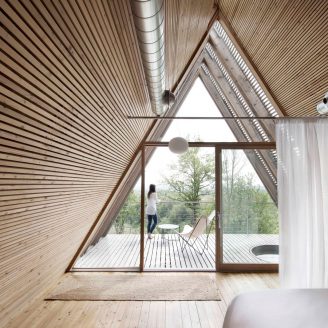 Atelier LAVIT took up the challenge of using prefabricated elements but without resorting to standardization. These factors are reflected in the roof, an A-shape with two fully glazed triangular elevations, which also acts as a wall and a load-bearing structure. The lodges weren’t designed as closed volumes from which the openings were subtracted, but as a space created by three inclined surfaces, following the Japanese logic of working on layers.