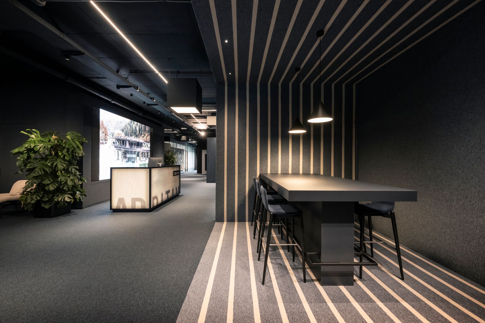 Similarly, numerous screens distributed throughout the office provide a continuous flow of updated information about Additive, accessible to all employees. Numerous potted plants add warmth and well-being to the atmosphere.