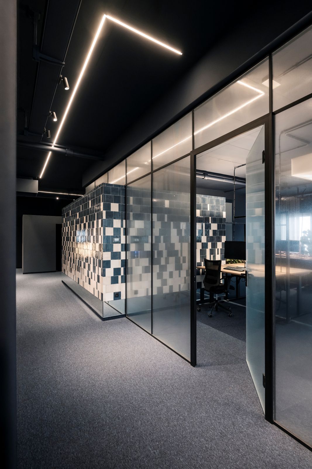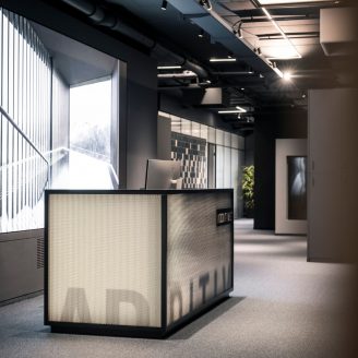 The predominant colour of the project is blue, presented in various desaturated shades and paired with beige tones to create refined contrasts— a palette inspired by Additive’s corporate identity. This led to the use of ceramic tiles arranged like digital bits, mirrors, perforated metal, and structured glass.