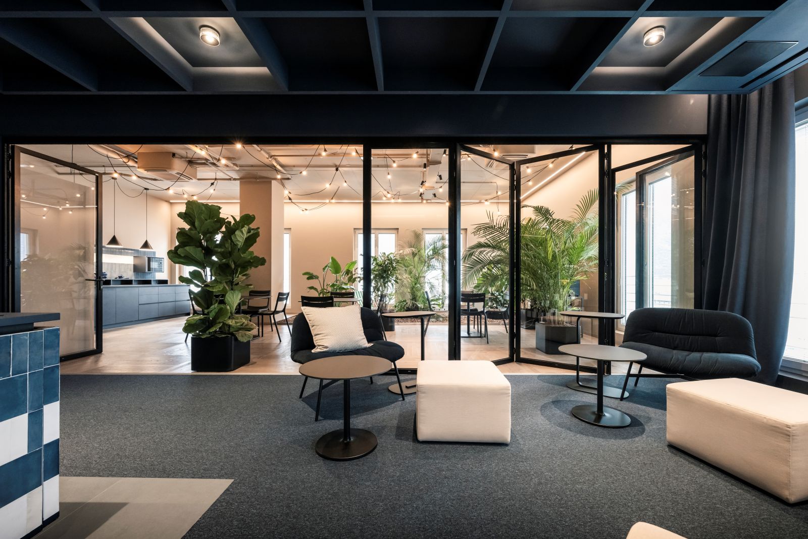 The communal space unfolds through a sequence of open and enclosed niches, private and public areas, transforming the office into a dynamic landscape offering meeting points, relaxation corners, eating spaces, phone booths, a coffee zone, and tiered seating for social gatherings. Exposed cables and ceiling-mounted systems emphasize the project’s tech-driven and dynamic aesthetic. On the southwest side, a 70 m² indoor garden houses a kitchen, tables, and lounge chairs, creating a welcoming space for lunch breaks. This area can be separated from the rest of the office with a movable glass partition, offering flexible use.