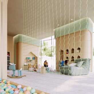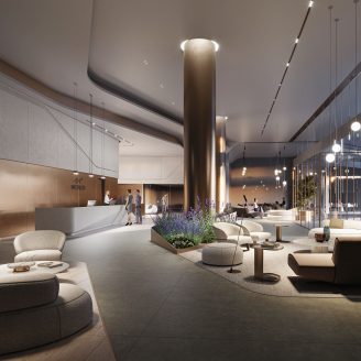The podium hosts the entrance lounge with a restaurant and café, an exclusive five-level parking lot, and a large terrace with an infinity pool and outdoor relaxation areas connected to multifunctional spaces and event areas. From here, the residential floors rise, organized into three blocks, making the structure more dynamic and improving the overall visual appeal.