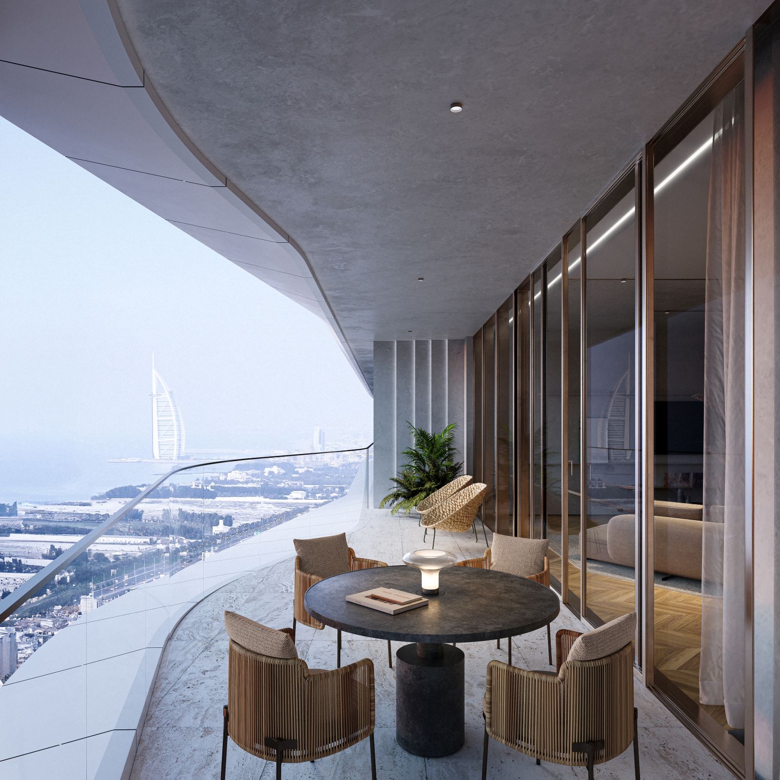 The design of the skyscraper takes shape following the wind flows, a constant presence in this area, shaping its lines and giving a sense of movement to the entire structure. The main façade, facing the Persian Gulf, features soft, sinuous shapes reminiscent of calm waterscaressed by the breeze. The inner side, facing the city in the direction of the desert, shows sharper lines inspired by the wind-sculpted shapes of the sand dunes.