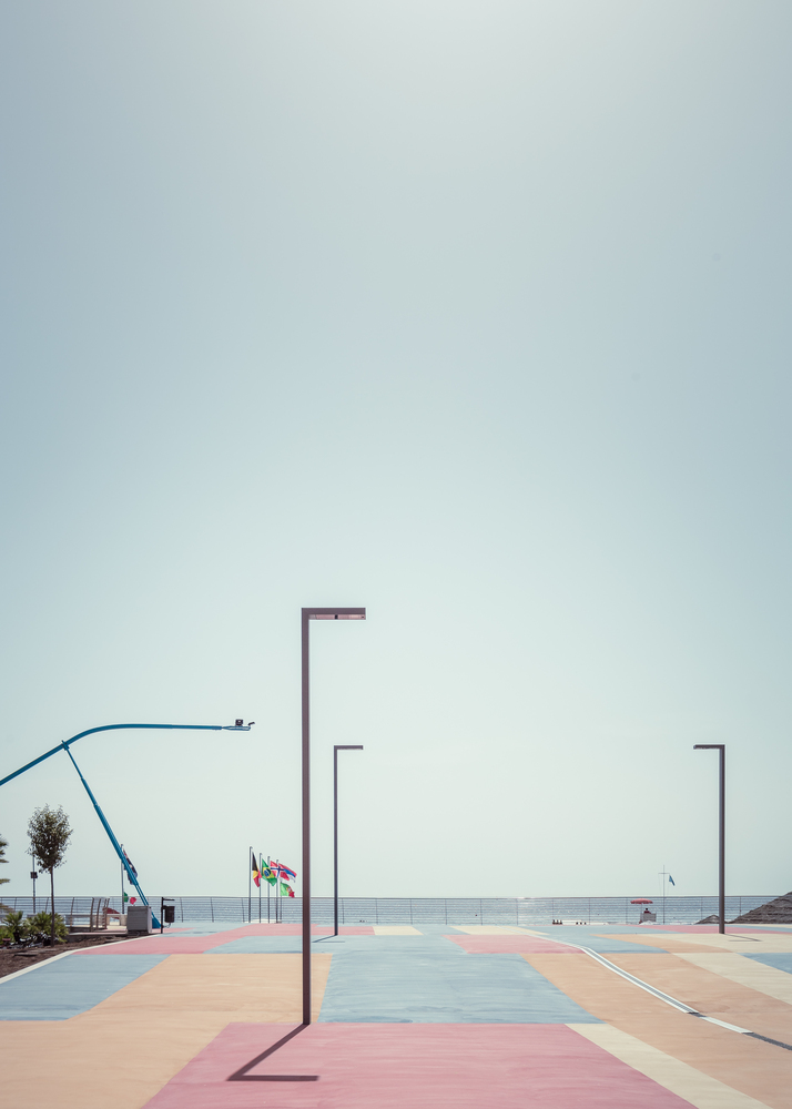 The design of the floor made up of large colored pixels is the result of a search for the types of ceramic tile flooring that in the 60s and 70s were widely used on the rivieras and beyond; the composition is inspired by some of these, transformed into a new and original abstract design, and the bright colors refer directly to the local landscape references.