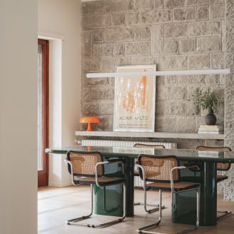The ground floor is symmetrically organized by the villa’s striking elliptical staircase, which is visible from the entrance. To the east, the living room features a stone wall that anchors an integrated fireplace in the conversation area. The furniture selection blends vintage pieces with design icons, such as the 1970s Marenco sofas by Arflex which define the TV zone. To the west lies the 40-square-meter American-style kitchen. It is dominated by a custom-made island in Persian Red Travertine, fully equipped with a cooktop, integrated hood, and teppanyaki plate. The kitchen is gently separated from the dining room by a full-height, powder-coated glass partition. The dining room features Marcel Breuer’s Cesca chairs by Knoll alongside a special edition table from Punto Zero’s “Big” collection, whose high-gloss lacquered finish amplifies the room’s natural light.