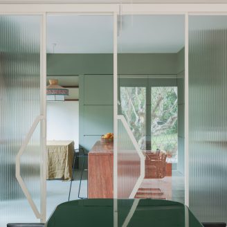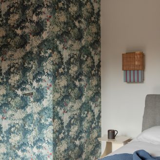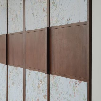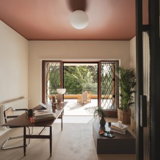 Matteo Soddu, co-founder of STUDIOTAMAT, explained that the renovation (400 sqm indoor area) was “a balancing act” designed to deliver “stimulating and relaxing spaces in equal measure”. The project meticulously preserved the villa’s historical essence, notably through the restoration of the original beech wood door and windows. Bespoke craftsmanship is evident at the entrance, featuring a custom-made wardrobe lined with L’Opificio’s “Viceversa Monet” fabric and elegant Tanganika walnut trim. Furthermore, original architectural details inspired new furnishings; specifically, a central rhomboid motif from the original 1950s ironwork inspired the design of the kitchen windows and the upstairs study.