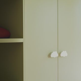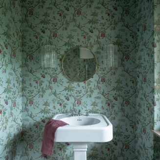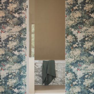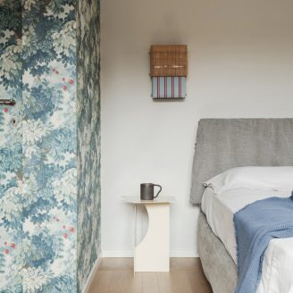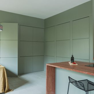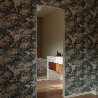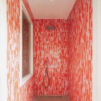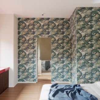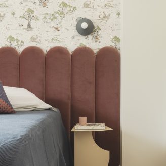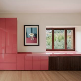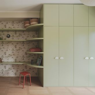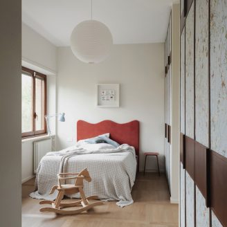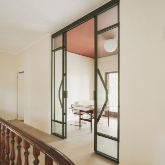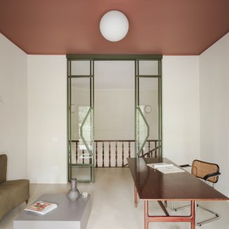 Upstairs, the first floor hosts the bedrooms. The flooring consists of oak parquet laid in a “sister” pattern, connected by a continuous cream-colored resin path. Central to this floor is the study, a sanctuary of light and inspiration featuring a custom glass wall, large window, and a ceiling painted in Tuscan Red from Little Greene. The daughters’ rooms reflect their personalities with custom wardrobes and beds upholstered in L’Opificio cotton velvets, set against Disney Home wallpapers. The shared vanity area between two bedrooms, featuring Valdama sinks, is distinguished by walls clad in tiles from Cristina Celestino’s Tivoli series for Fornace Brioni, creating a stylish transition.