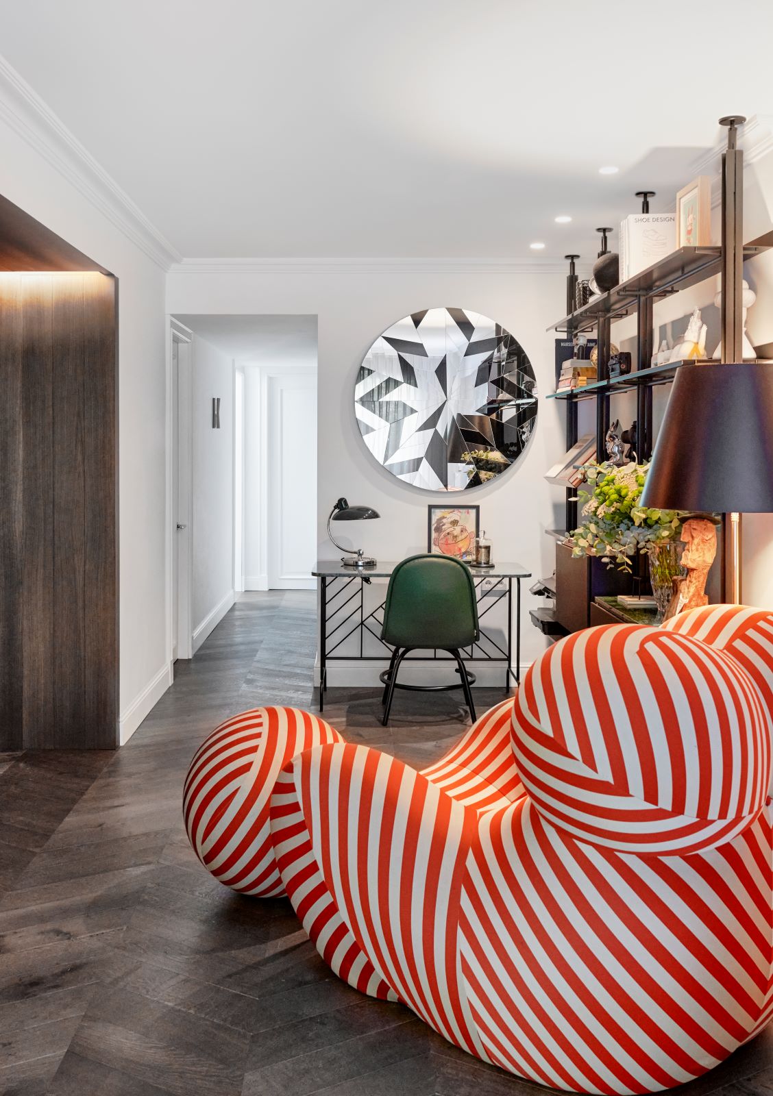 The area is surrounded by a Desalto black metal shelving unit while the Up 50 armchair by Gaetano Pesce from B&B is one of the most important pieces; the living room opening up to the kitchen is the liveliest part of the home: with plenty of natural light, it is combined with an area of sofas highlighting the pattern in the Sister mat designed for Roche Bobois & Toulmende Bouchart.