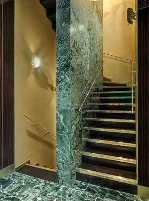 Through a Victorian-style window, consumers enter a vestibule, where the staircase with its rosewood steps – the heart of the historic building’s renovation – winds seamlessly around a robust septum in green Alpi marble, which visually and physically connects the different levels; gold-coloured wallpaper adorns the stairwell, dominated by an ethereal chandelier with macro brass leaves.