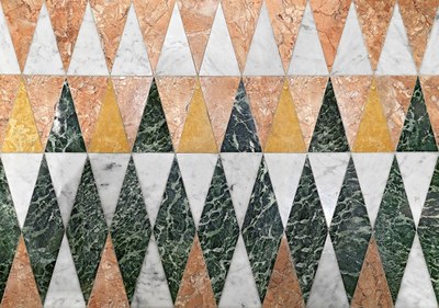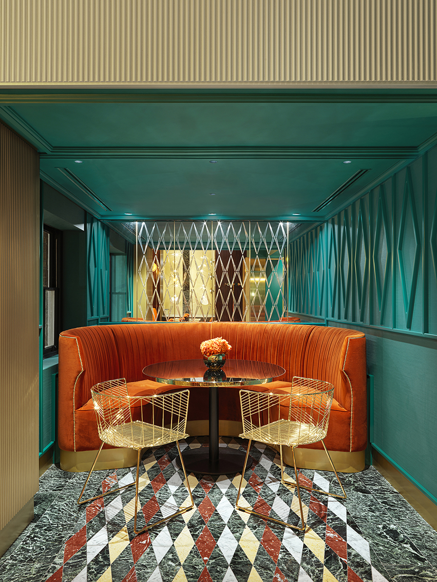 The interior design draws heavily on the Italian architectural culture of the Sixties, from which it takes its refinement of the construction and decorative details, the conception of the space as a living set, and the cocktail of elegance and irony in its geometric stylizations: the rhombus constitutes the matrix of the dynamic elements that characterize design, from the macro engravings of the boiserie to the decorative patterns of the polychrome marble floors.