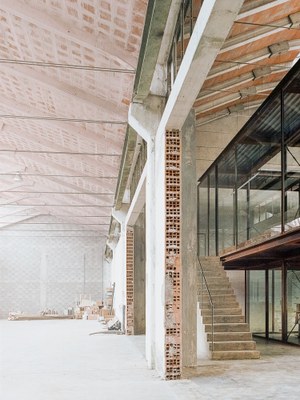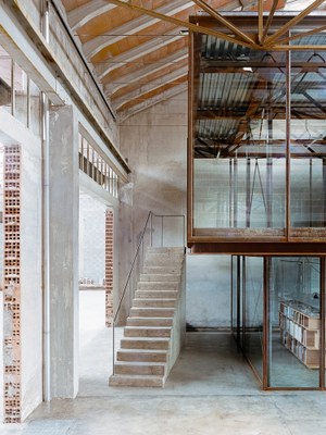 Their new workplace, which also includes a library, is located into a steel-framed, two-storey glass volume inserted inside the factory and the poured concrete elements blend with the existing floor; all the walls are made from glass to create an open and bright space and freestanding, poured-concrete staircases are the protagonists of the space.