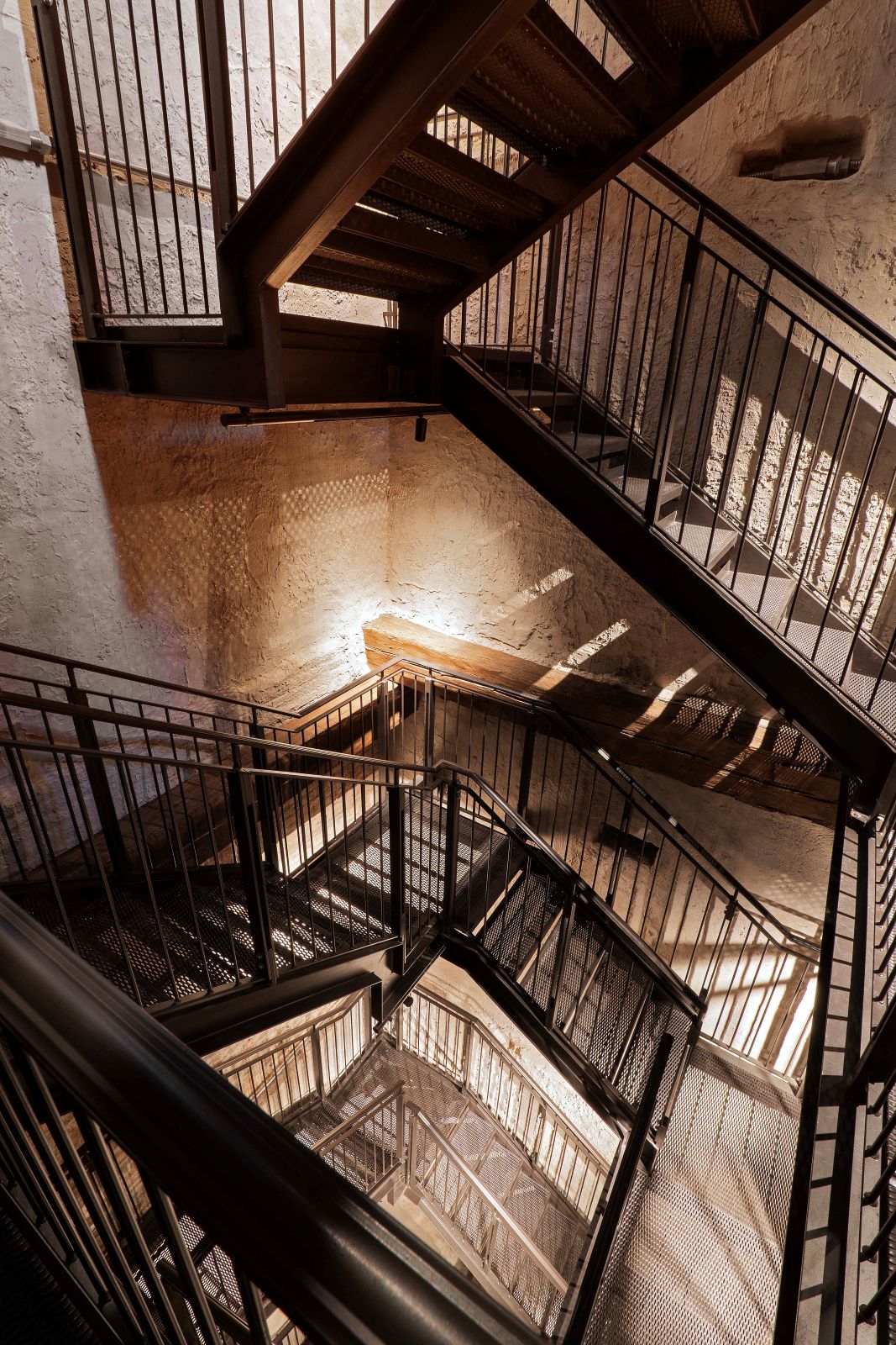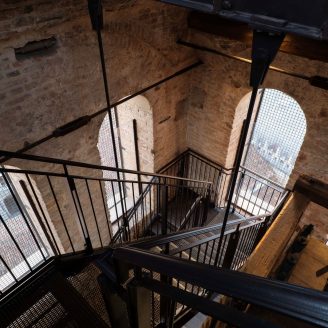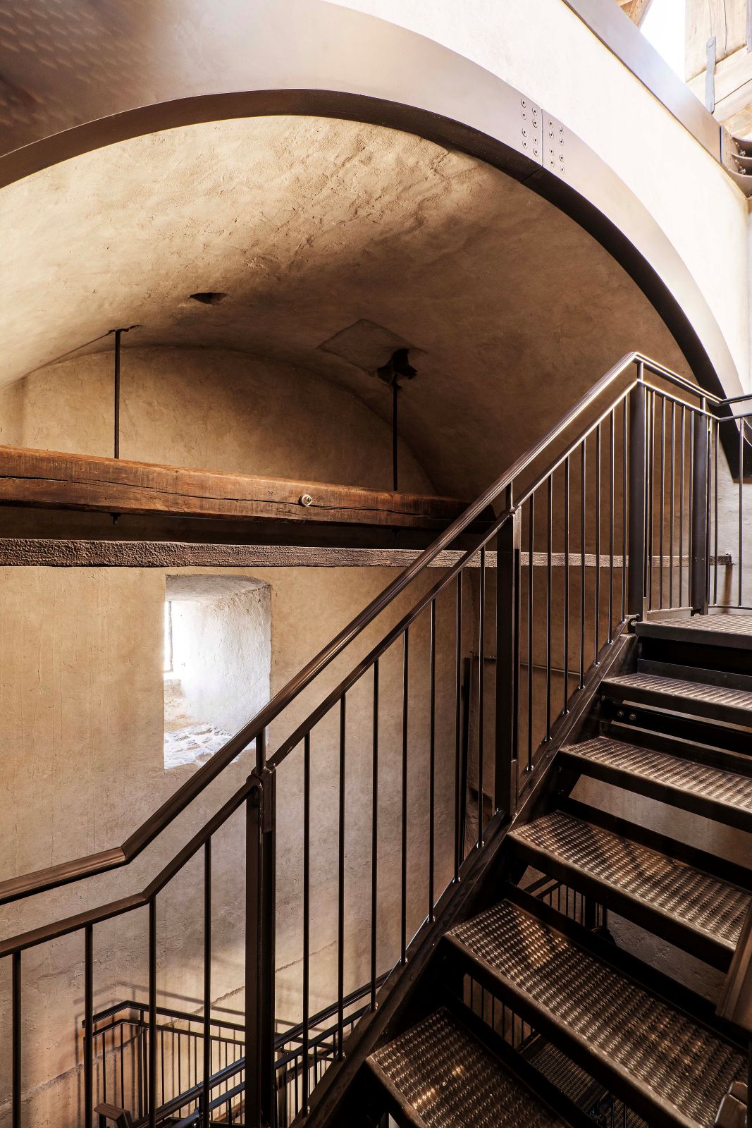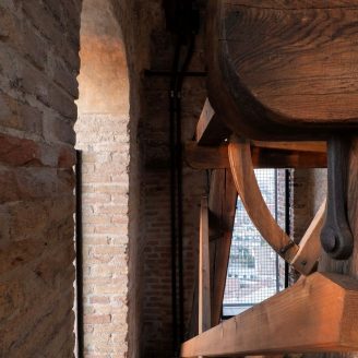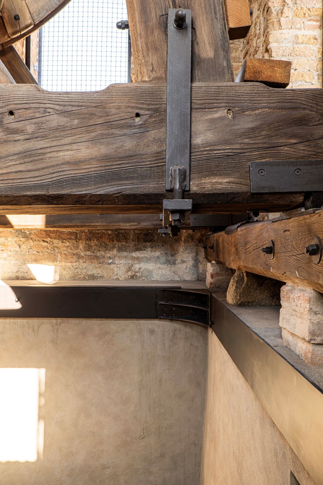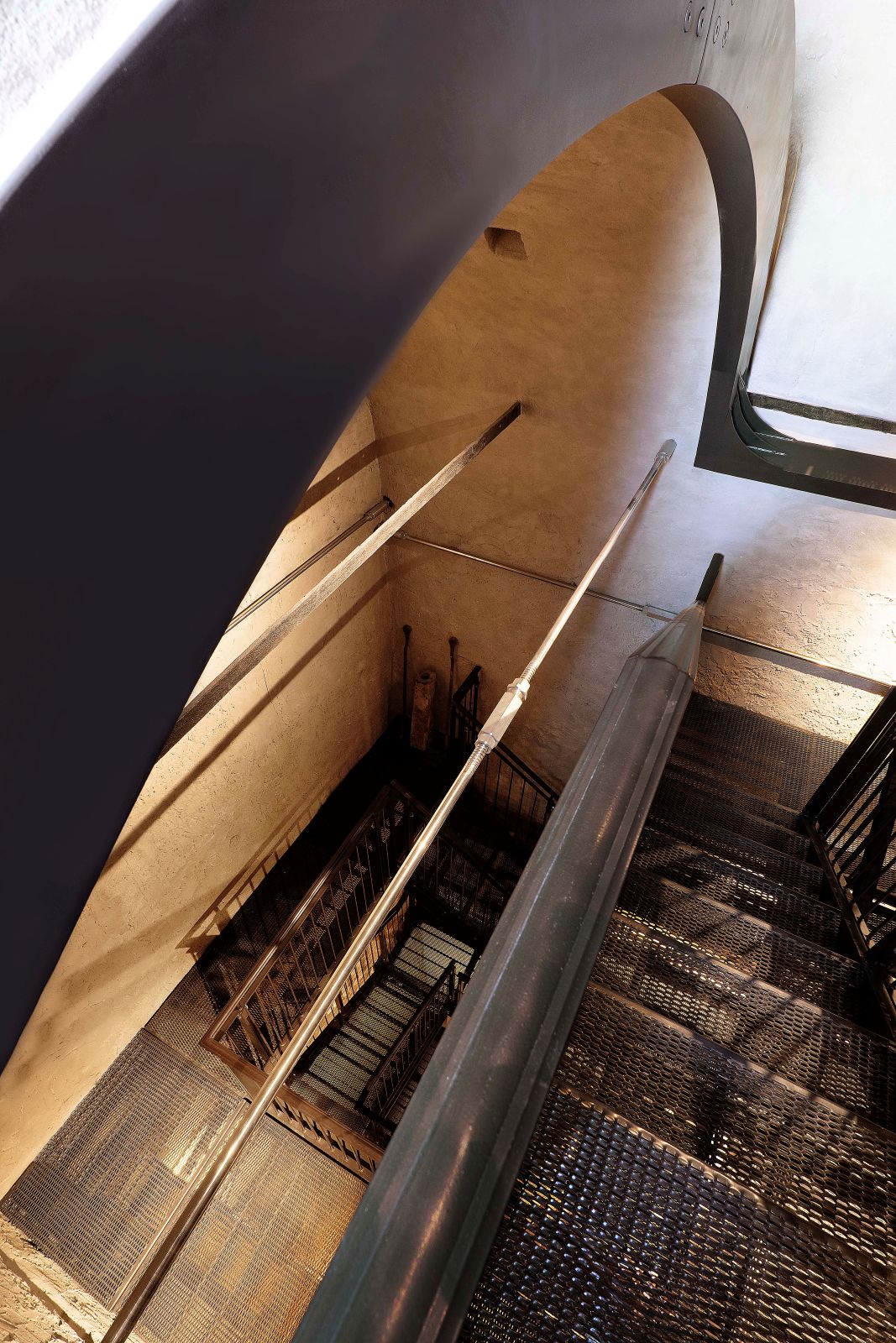 The heart of this transformation is the new internal steel staircase featuring 190 steps, designed to replace the original wooden structure in compliance with fire-safety regulations. The intervention required sophisticated engineering solutions, including the installation of next-generation internal chains and tie rods and steel ring beams to ensure the stability of the historic masonry. Great care was taken to keep historical traces visible, such as the consolidation dated January 17, 1940, which remains at the entrance. Additionally, the historic bell was temporarily moved using jacks to allow the staircase to reach the highest accessible level.