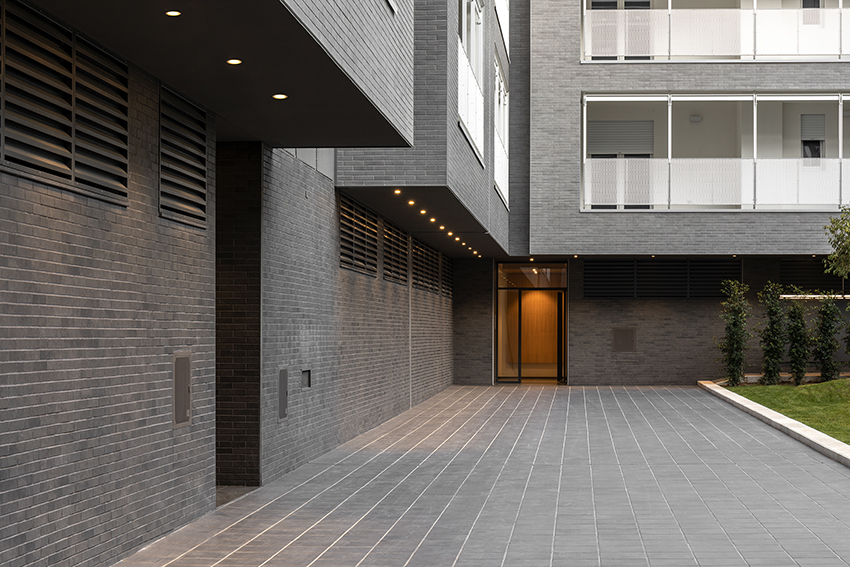 The regularity of the elevations represents the main character of the building: the uniform dark grey brick curtain becomes a sort of neutral score where dynamic rhythms are delivered by protuding, niche white metal sheet elements.