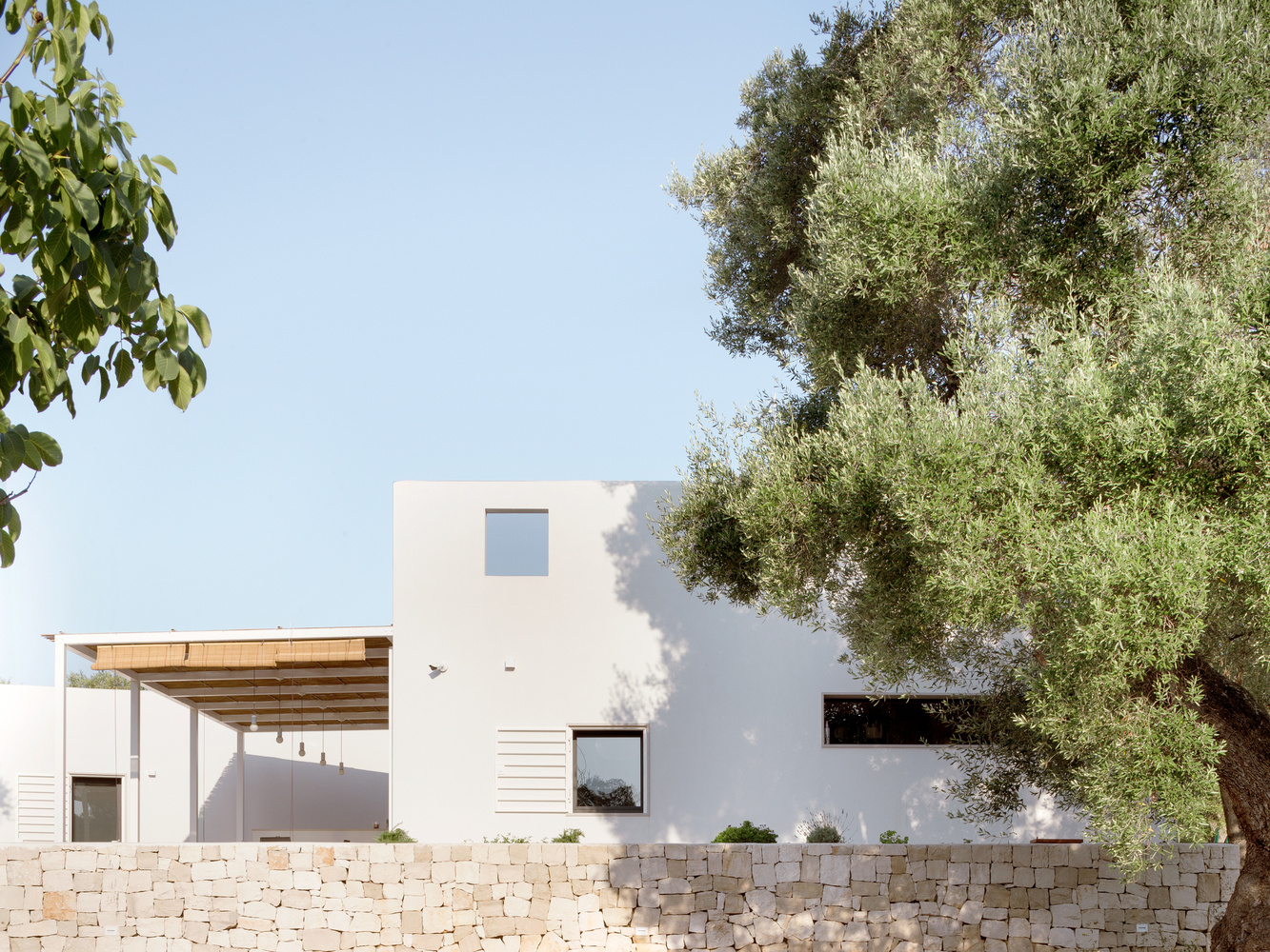 In particular, an existing centuries-old olive tree on a natural podium is the real central point of the building, whose composition is characterised by a cube that contains the living area of the villa and intersects a low oblong prism of the sleeping area. The two volumes are slightly rotated to embrace the tree, the center of an open terrace and the main relational space.