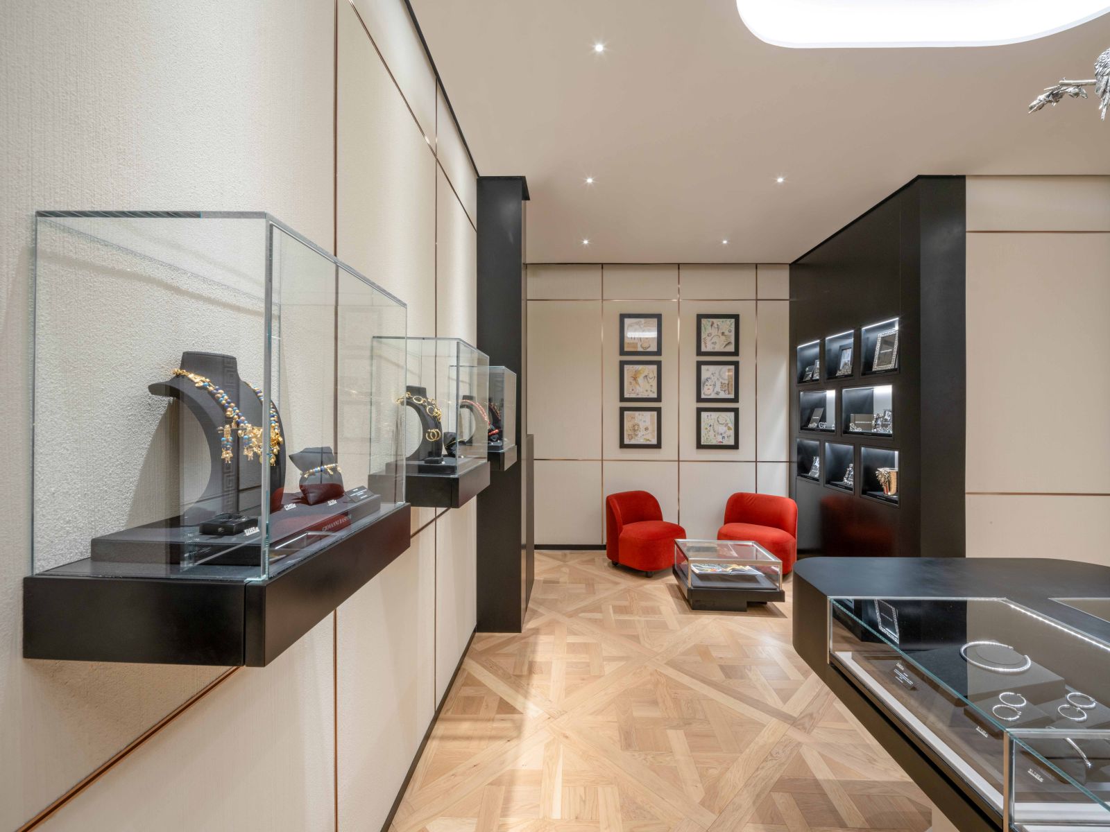At the heart of the store is a central table that recalls the idea of an atelier: a traditional handcrafted workshop reimagined through a contemporary lens. Surrounded by terracotta-colored stools, designed in collaboration with Joysliving, it invites visitors to explore the collections. Above it, a silver installation inspired by the brand’s Animalier collection, entirely handmade, depicts a branch with parrots and creates a parallel in the Chinese symbolism of nature. This branch descending from the ceiling adds a scenic and distinctive presence, evoking themes of harmony, connection, and beauty, values shared in the artistic representations of both cultures.