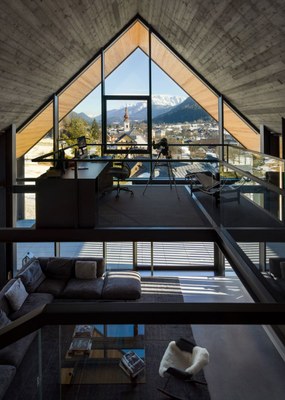 The building is situated on a steep slope and has been built to perfectly befit the Alpine scenery and camouflage itself in the natural environment: it is characterised by light-filled interiors, timber-clad façades, steeply pitched gable roofs and an interesting concept of multiple perspectives enhances the journey to the entrance of the house.