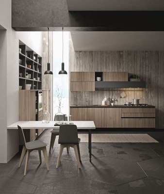 In the age of the art of cooking’s celebration the preparation of food is much more important than the act of consuming it: for this reason ARAN Cucine proposes Faro and Quadro, models which are combinable with each other and capable of ensuring maximum style coherence between all elements, whether they are wall units or shelves, drawers, open modules or kitchen cabinets.