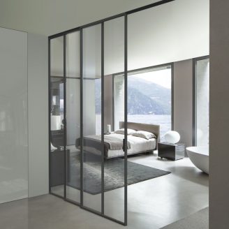 Designed to separate spaces with lightness and elegance, prioritizing the passage of natural light and visual depth, Bellagio sliding system maintains a physical continuity within the spaces, while respecting their functional independence thanks to a minimal design solution marked by a sober decoration.