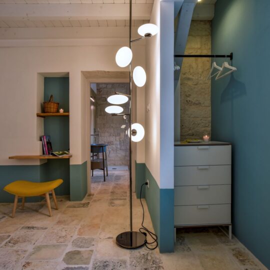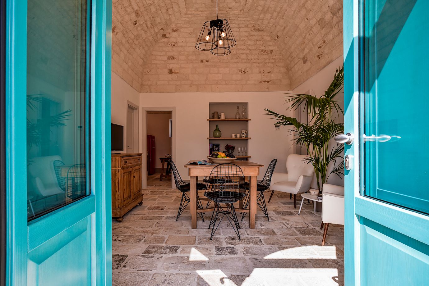 In the building, redesigned by Architect Floriana Errico and Engineer Marcello Pellegrini, the contemporary furnishings blend harmoniously with the typical architecture of the Apulian farmhouses of yesteryear: the renovation work has reinterpreted the architecture of the ancient building, maintaining unaltered its original characteristics and connection with the territory thanks to the use of local materials and handcrafted furnishing elements, complimented with original design pieces.
