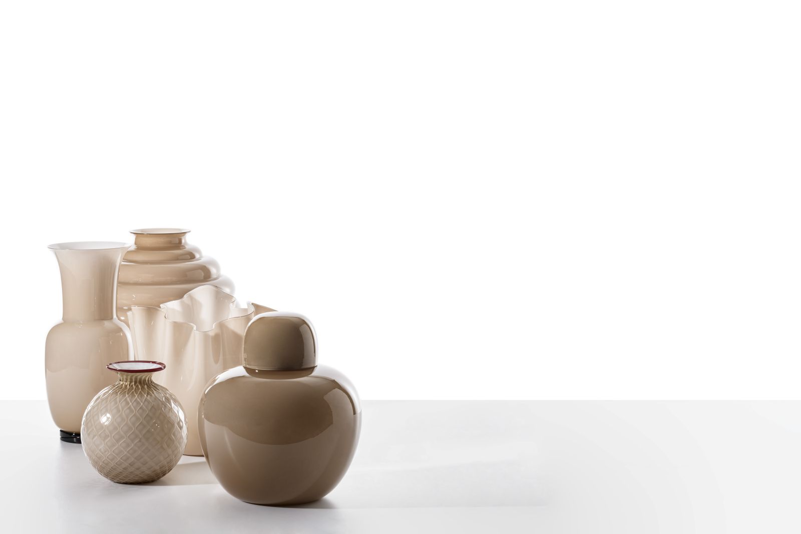 The iconic Fazzoletto, Deco, Opalino, Clessidra, Clessidra Sommersa, Balloton Fiori and the Monofiore Balloton —now introducing the opalescent (opalina) finish for the first time—, along with the Opachi, Ritagli, Veronese designer vases and the Battuto a Nido d’Ape in the masterglass collection, evoke the richness and complexity of freshly roasted coffee. A variety of finishes are available, ranging from the transparent versions that catch and reflect the light with extraordinary intensity, to the opaline ones that wrap the shapes in a delicate, evocative softness.