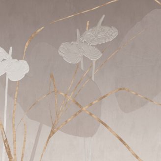 Following a precise aesthetical vision, against the neutral backdrop of earthy hues like dove grey, grey, powder-pink, and clay, exquisite weaves come to life while botanical patterns, highly impactful in tactile and visual intensity, spring forth in shades of gold, brass, and platinum, with opulent tropical foliage, impalpable petals and light branches in bloom.