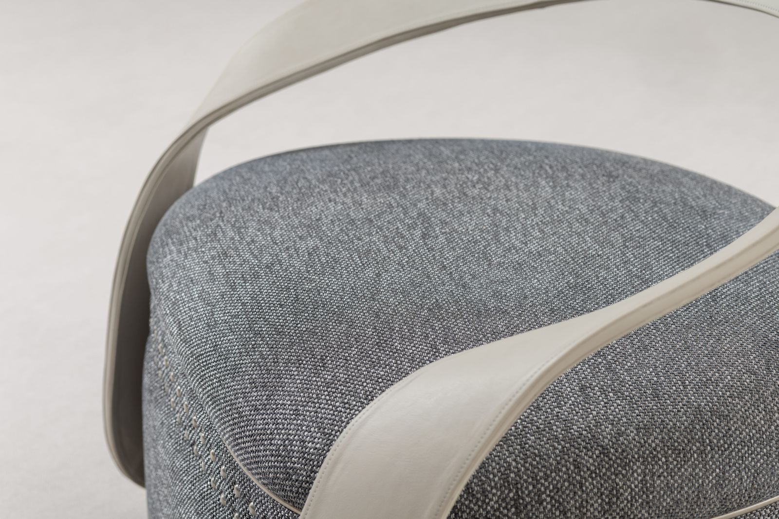 Meticulous attention to materials and sartorial details is evident. The arched structure is wrapped in natural leather, which harmoniously contrasts with the seat, made of a soft technical fabric. The design enhances expert craftsmanship through significant details, such as studded metal detailing that brings a refined, tailored touch.