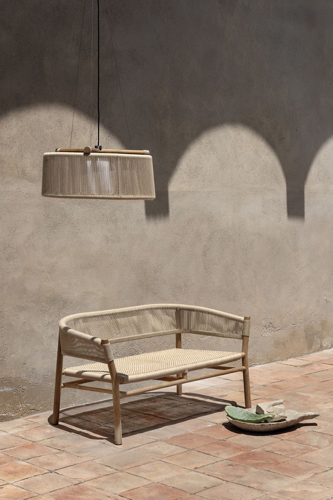 The Kilt lamp (diameter 62cm and height 30cm) confirms the same materic characteristics as the furniture in the larger collection, where natural or pickled teak (FSC certified) is matched with polypropylene cord, here available in the refined shades of Sand and Dark Grey.