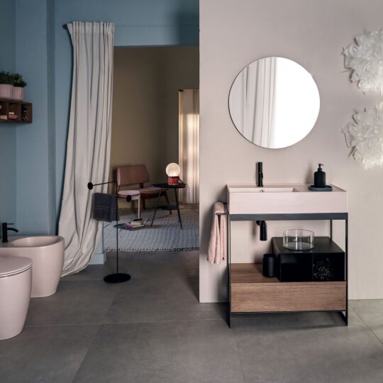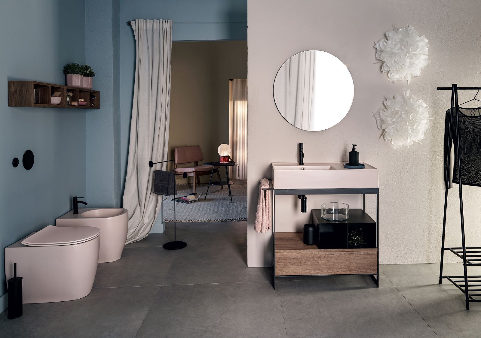 With the addition of a wooden shelf, the structure becomes a top for over 100 models of lay-on washbasins; moreover, the ceramic for the washbasin can be chosen from a selection of eight colours to create a unique, personalized identity for your bathroom.