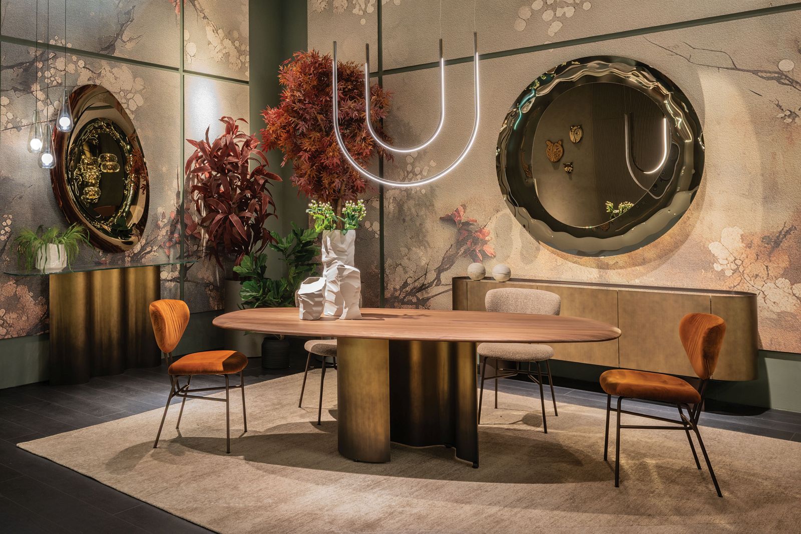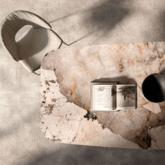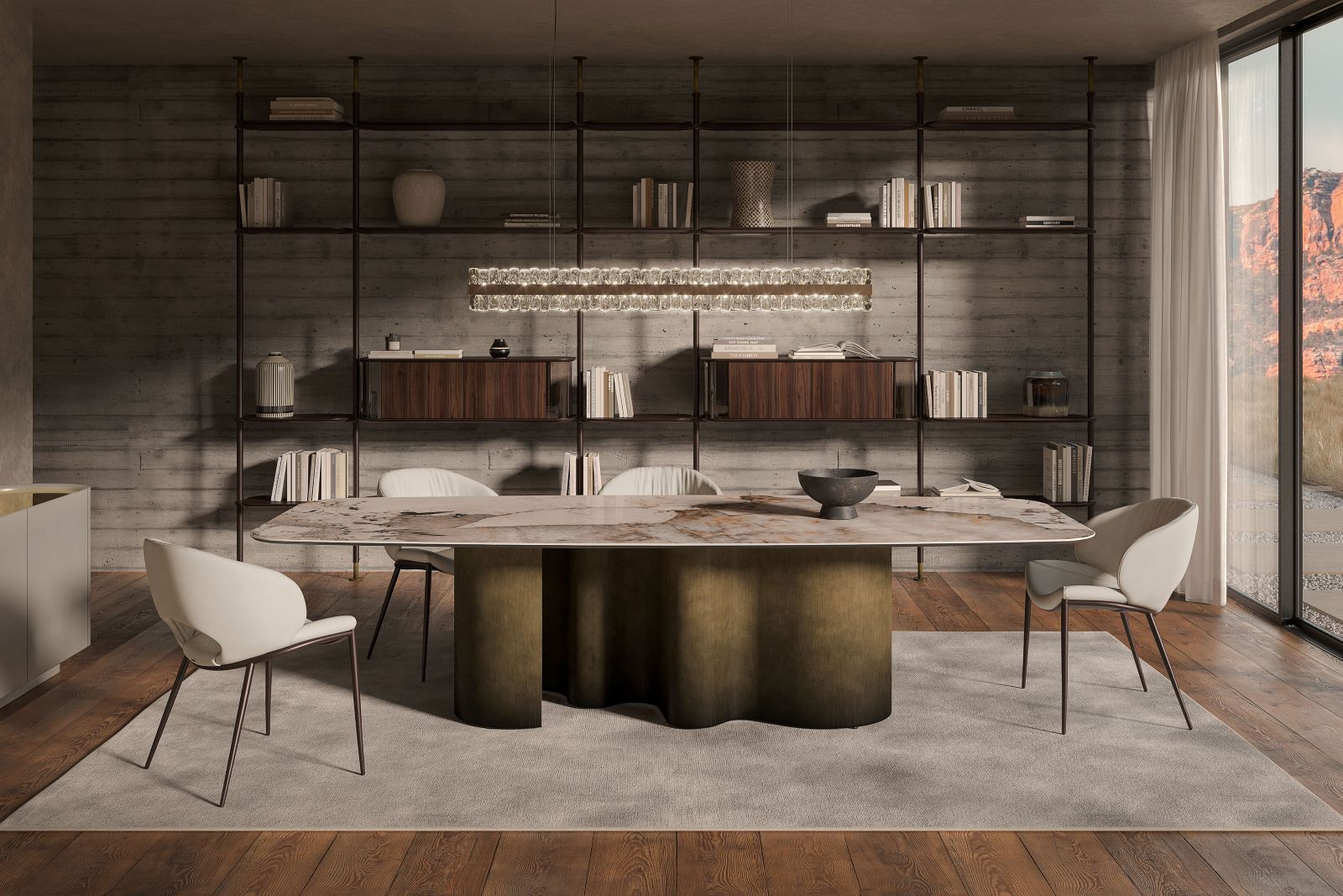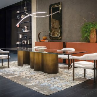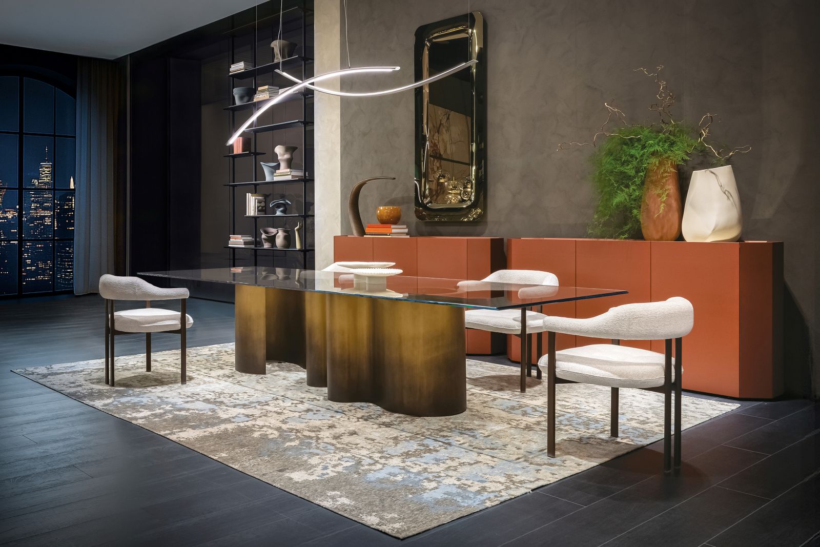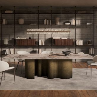 Both novelties are defined by the marked contrast between sculptural form and perceived lightness. This is emphasized by the undulating silhouette of the base. The core design is represented by the curved metal base, which is created from a single piece, enhancing the table’s personality, and emphasizes the contrasts between solid and empty spaces.
