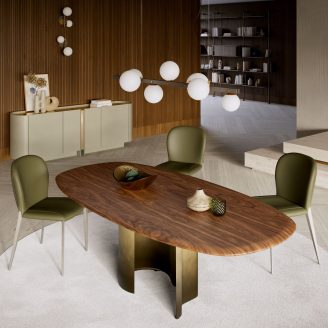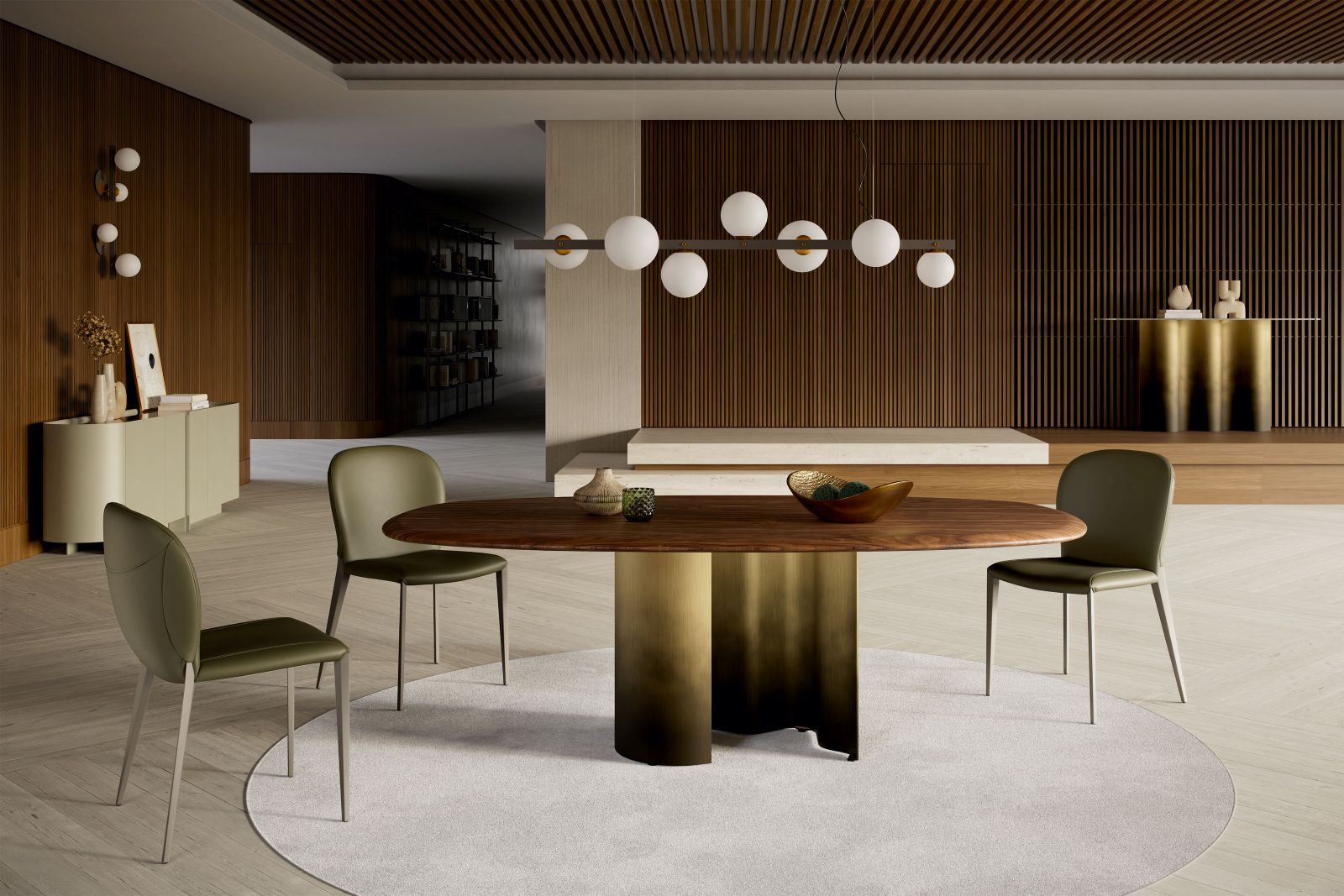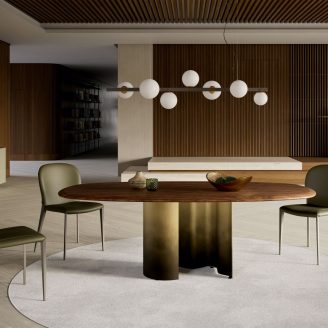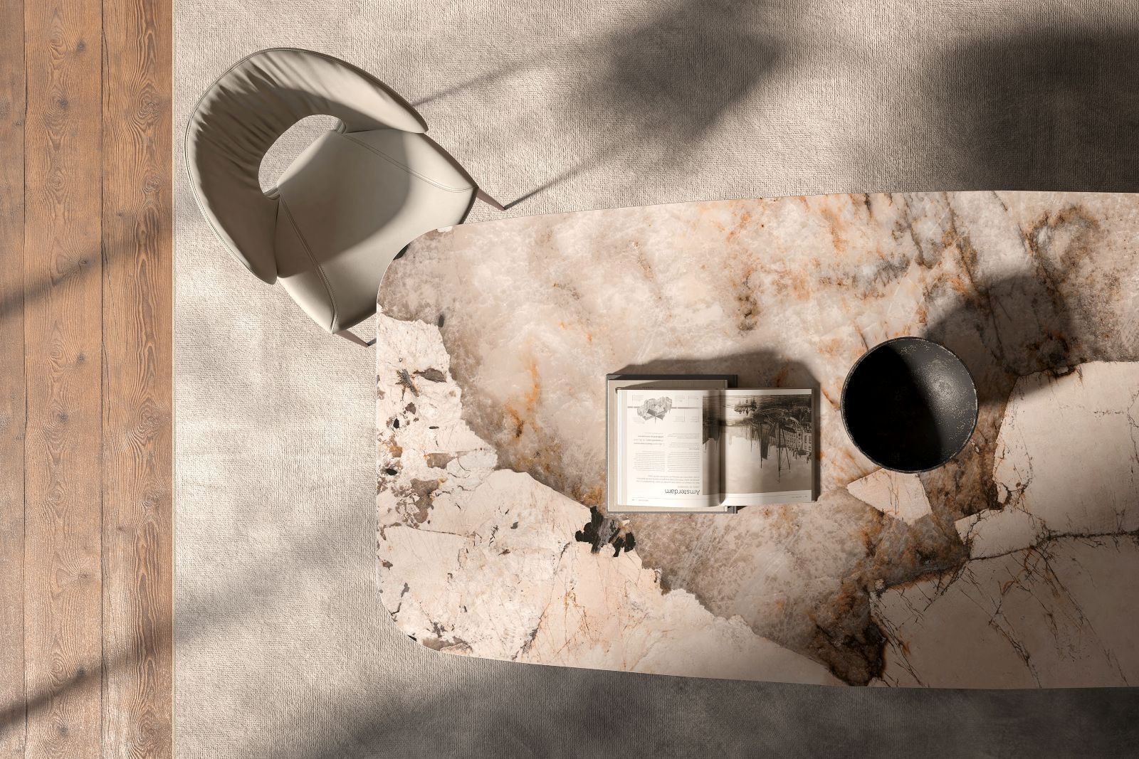 The voluminous dimensions of the Papel table are evident. In the Papel 3.5 Glass version, the transparency of its crystal top highlights the base below. The Papel family includes models such as Papel Keramik and Papel Keramik Premium. The latter is distinguished by the Brushed finish of the base, which is handcrafted by the skilled artisans. The family is completed by the Papel Wood table, available in a variety of shapes and natural wood finishes.