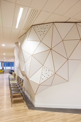 The second project is about Caisse Des Depots Group in Paris, which has chosen a tailor made wall installation: the surface wraps the corner to create a special feature element that strongly chahacterise the room; then, in addition to the given Wood-Skin’s standard acoustic performances this piece has been implemented with a series of engineered holes of different sizes with sound absorbing material in the back helping reducing the room’s reverberation.