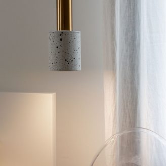 The lighting design of the apartment becomes another focal point. The gold-colored illuminated pieces we find both in the salon kitchen area as well as in the bathrooms accompany the other color choices of style. While in the hallway a white suspension body with opal glass spheres (model “Grover” by Westwing collection) stands out against the black wall. In the master bedroom, suspended lights in Venetian cement create a slight distance from the “total white” of this environment.