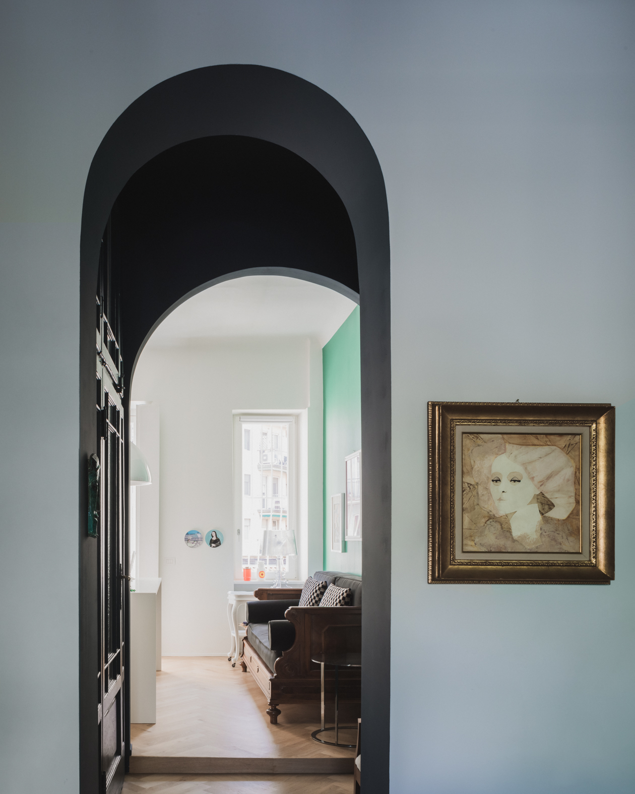 A new arch was opened to link the kitchen to the living room, creating a new source of light for the west-oriented living area. The arch was the key element of the restoration: it was almost obsessively proposed in different heights and diameters, producing unusual perspectives inside the apartment.