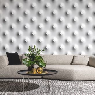 Theatrical glimpses and repeating motifs seem to burst out of the surface with stripes, polka dots and other optical designs in numerous colour alternatives and on five types of material, with no limit to the height and width of the roll starting from 50 cm.
