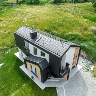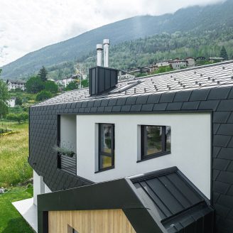 The black colour of the PREFA DS.19 shingle blends elegantly with the surrounding green fields and woods, giving the structure a sophisticated look that seamlessly integrates with the other materials, such as local larch wood and plaster for the exterior insulation. The DS.19 PREFA shingle gave the project also a visual uniqueness, thanks to the possibility of installing it both horizontally (starting from a slope of 17 °) and vertically. This allowed continuity between roof and facades, thus creating a second skin of the building, interrupted only by the larch wood cladding. In addition to the ease and speed of installation, the product is an optimal choice for its considerable weather resistance, an essential feature in this specific area.