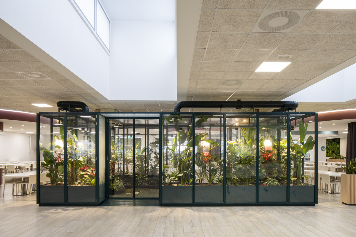 Il concept che ha guidato il progetto si è ispirato alla complessità armonica di un organismo umano, dove ogni parte collabora e comunica con le altre. Al centro, un’arteria principale convoglia i flussi verso il cuore pulsante del campus: una mensa completamente ripensata come spazio polifunzionale, aperta a dipendenti e clienti, che alterna zona pranzo, area privé e ambienti per eventi. Il nuovo spazio accoglie poi anche La Fabbrica dell’Aria®, il progetto di serra indoor realizzata sul concept di Pnat – collettivo di designer, architetti e biologi spin-off dell’Università di Firenze – per la purificazione dell’aria grazie a un sistema di filtrazione botanica.