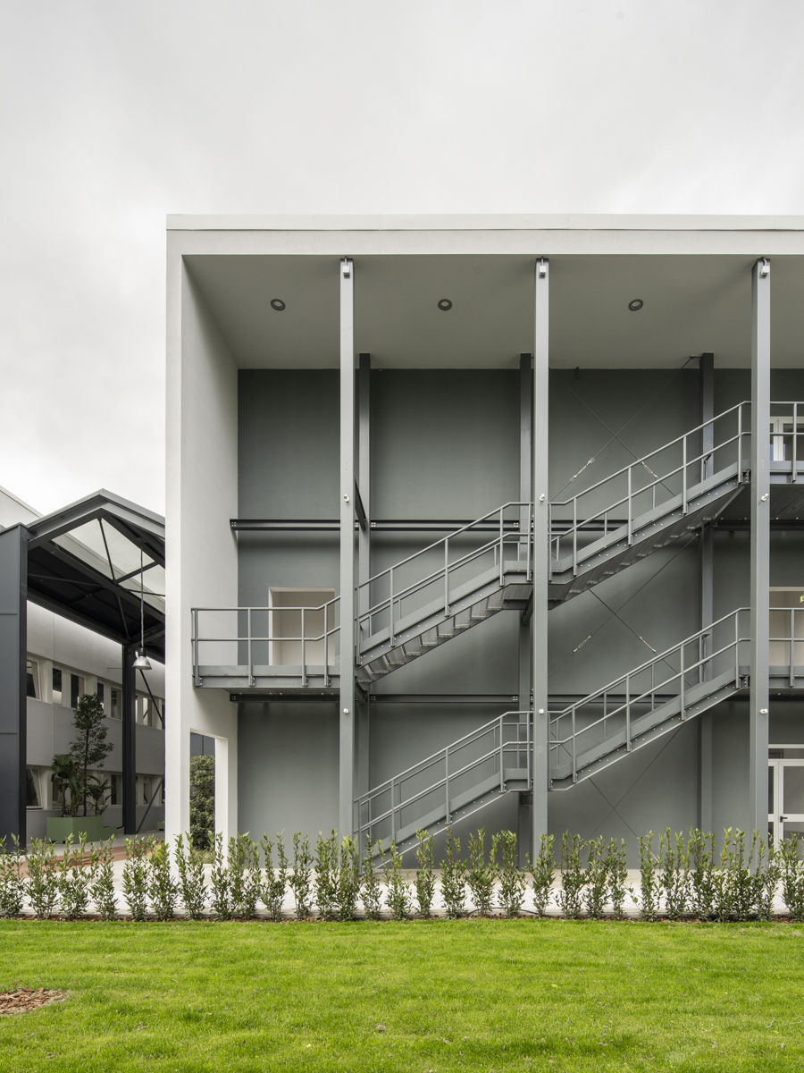 Il percorso principale che attraversa il campus è oggi protetto da una pensilina continua e attenta all’accessibilità grazie all’inserimento di una striscia tattile per ipovedenti. Lungo questa arteria si inseriscono anche piccole sale meeting vetrate e insonorizzate, progettate come box nel verde: al tempo stesso luoghi privati, ma in connessione con l’ambiente.
