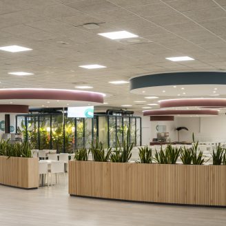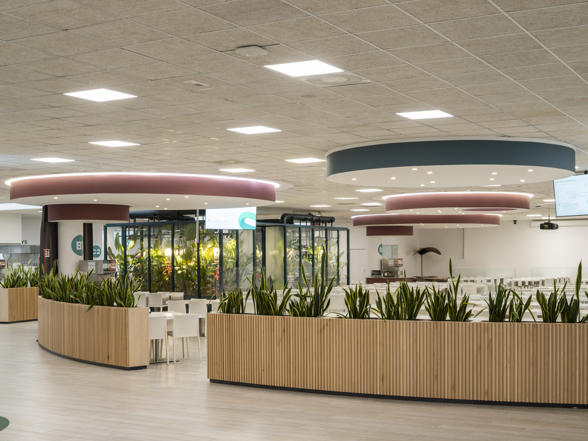 Il concept che ha guidato il progetto si è ispirato alla complessità armonica di un organismo umano, dove ogni parte collabora e comunica con le altre. Al centro, un’arteria principale convoglia i flussi verso il cuore pulsante del campus: una mensa completamente ripensata come spazio polifunzionale, aperta a dipendenti e clienti, che alterna zona pranzo, area privé e ambienti per eventi. Il nuovo spazio accoglie poi anche La Fabbrica dell’Aria®, il progetto di serra indoor realizzata sul concept di Pnat – collettivo di designer, architetti e biologi spin-off dell’Università di Firenze – per la purificazione dell’aria grazie a un sistema di filtrazione botanica.