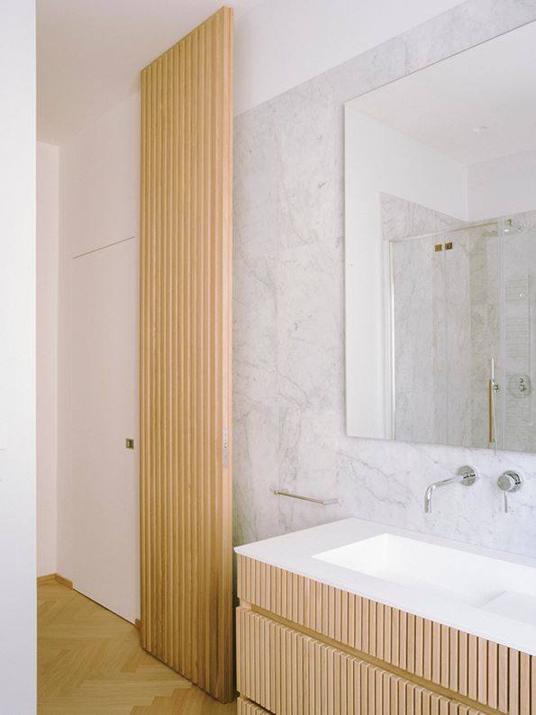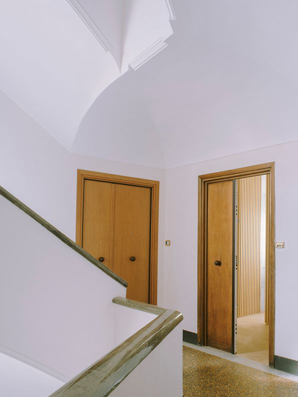 Gli architetti hanno rivoluzionato gli interni per amplificare la permeabilità e la versatilità degli ambienti: il corridoio labirintico e angusto diventa così uno spazio confortevole grazie all’apertura della parete di fondo, che mette in connessione visiva chi entra con l’ambiente principale del soggiorno-studio, caratterizzato da una boiserie di listelli in rovere verticali.