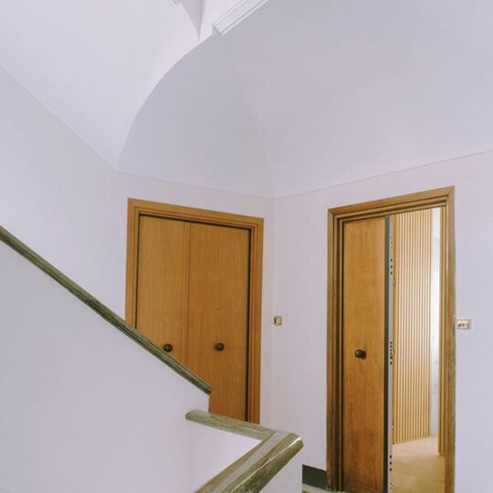 Con la sua particolare conformazione pentagonale concepita per ospitare jam session ed estemporanee musicali, la sala è esaltata nel suo minimalismo dalla boiserie che, come la cassa di un misterioso strumento musicale, organizza i percorsi e nasconde gli spazi secondari e di servizio, come la cappottiera, l’accesso al bagno, il passaggio verso la cucina e l’armadiatura semicircolare che ridisegna in maniera organica lo svincolo principale della casa; allo stesso tempo, il sistema a listelli affina l’acustica dello spazio e amplifica la diffusione della luce naturale.
