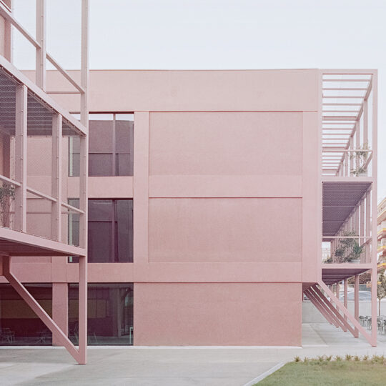 Le travi di acciaio rosa formano una struttura che si estende dalla facciata esterna e crea aule e corridoi all’aperto per il divertimento degli studenti; essa si completa con l’intonaco ruvido e liscio delle pareti esterne e la pavimentazione chiara.