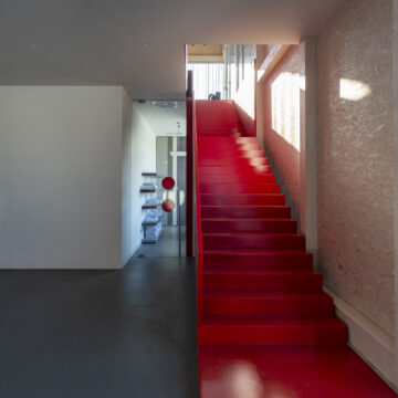 Il colore che caratterizza gli spazi interni è il rosso, che crea giochi e disegni geometrici spezzando la monotonia. Se al primo piano si trova la LAGO Osteria e la sala conferenze, il piano terra ospita invece la LAGO Logistica con gli uffici, lo spazio produttivo, spogliatoi, infermeria e uno spazio relax per i trasportatori. Il risultato è un progetto che rielabora i codici dello spazio produttivo per comunicare al meglio il valore di una grande azienda contemporanea.